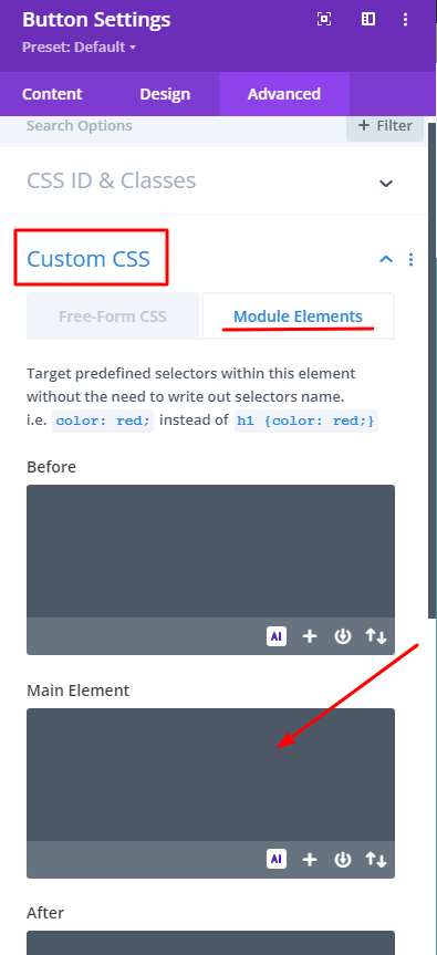 Now go to “Custom CSS”, if asked, select “Module elements” and you should see the code editor now: