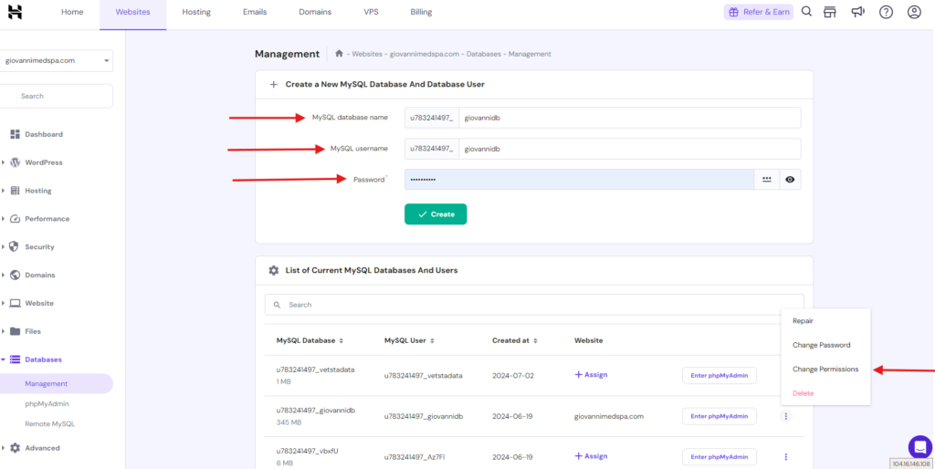 - Confirmation: Once you’ve completed the above steps, your database should be ready for use. You can confirm this by going back to the “MySQL Databases” section and seeing your newly created database listed there.