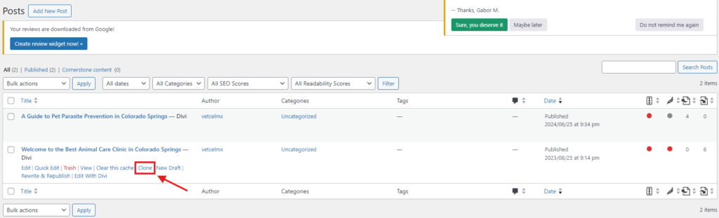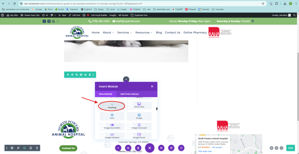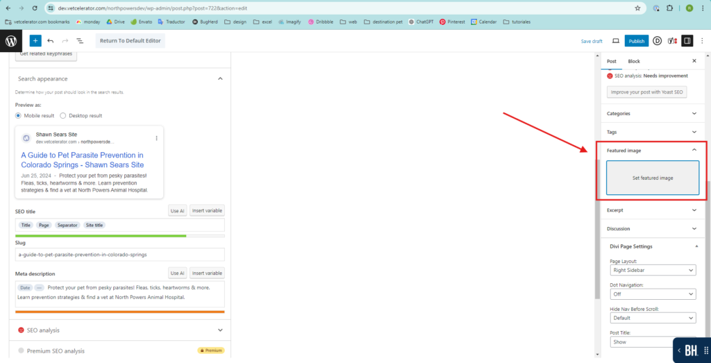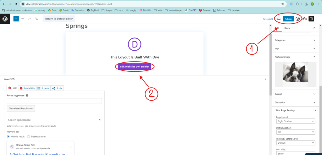 • Once you have the title, SEO, and image, click on Publish to publish the post. Then, enter the website builder you are using (Divi Builder, Elementor, or Avada). This option appears so you can edit from the front end of the website.
