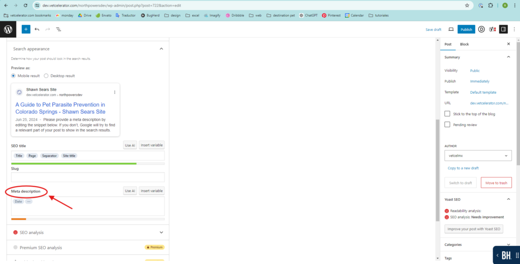 • Further down, you will find Yoast SEO, where you should add the Meta description.