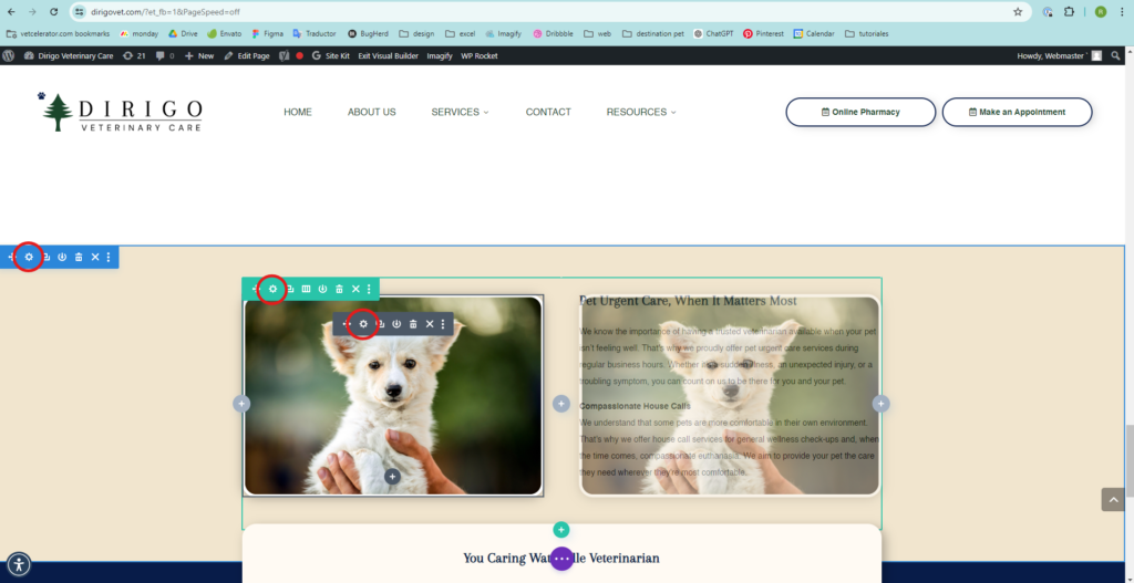 - To enter the Divi Builder editing menu, hover over the elements or containers you want to edit, and a line of icons will appear. Click on the gear icon to open the menu.